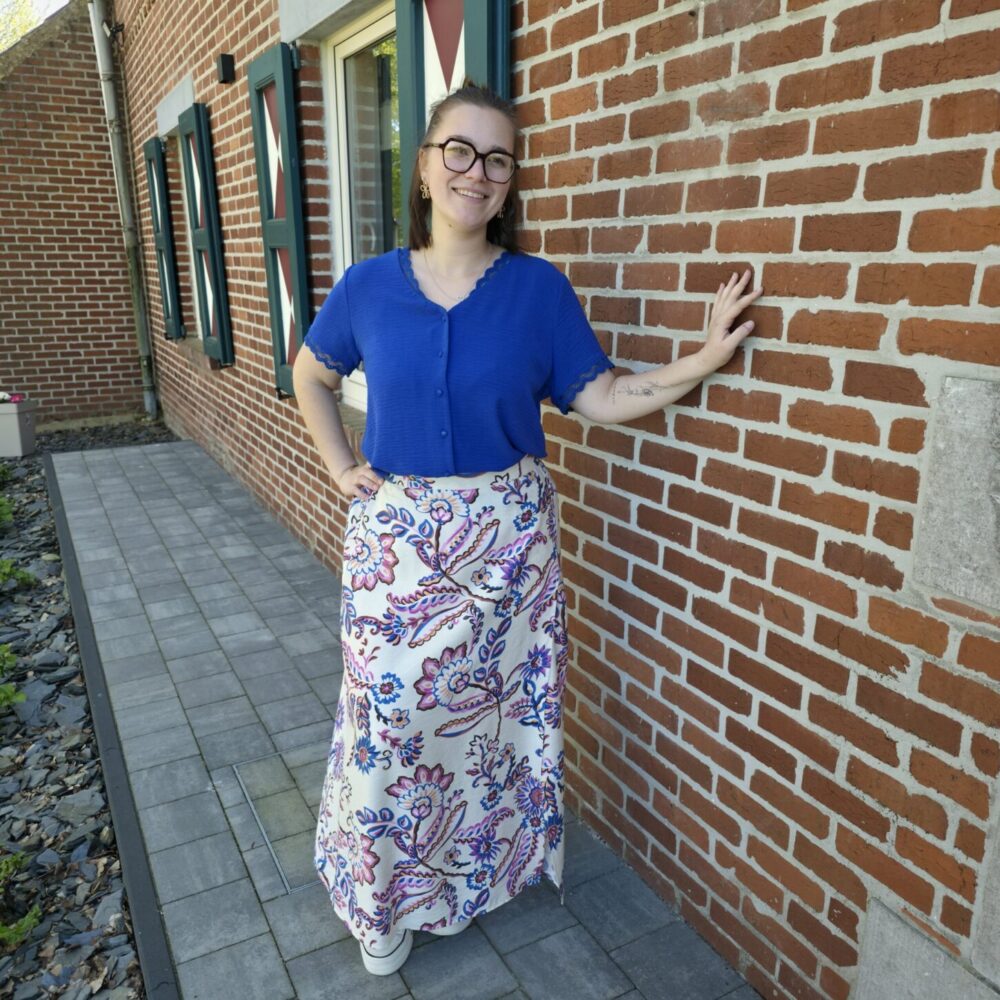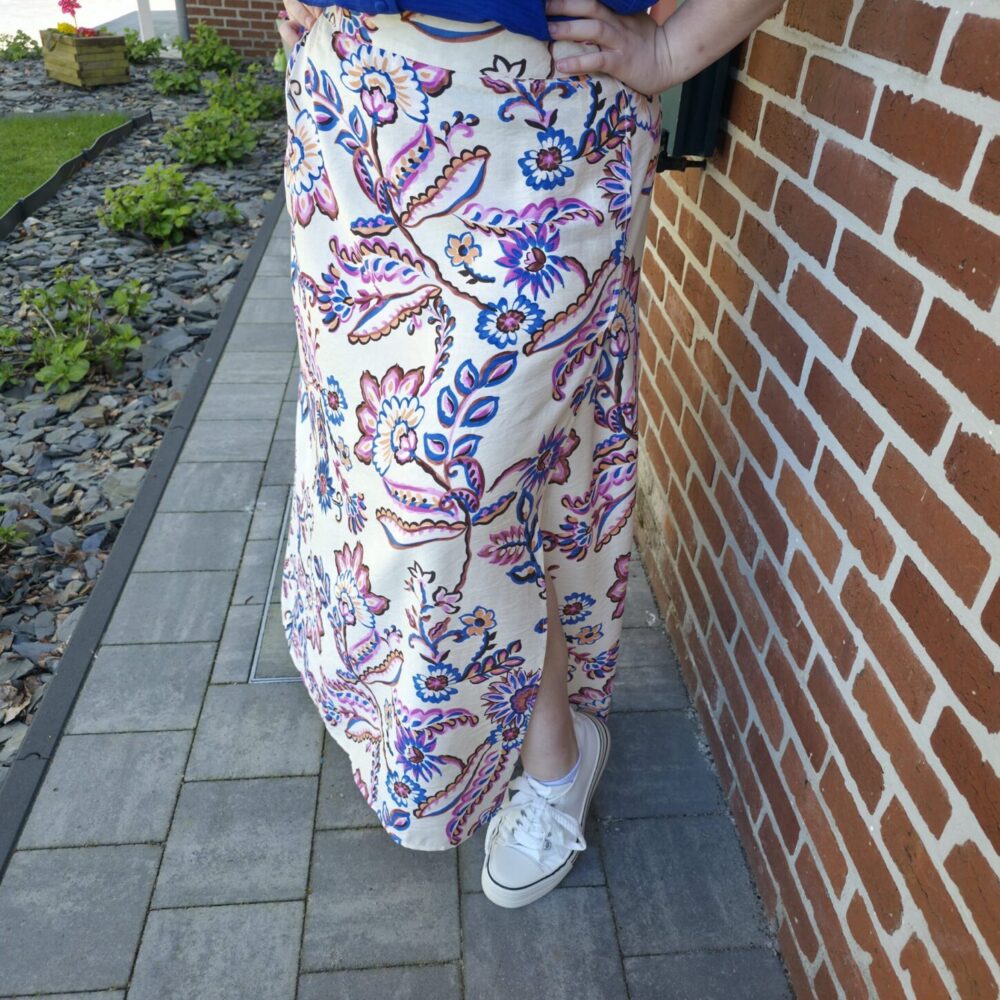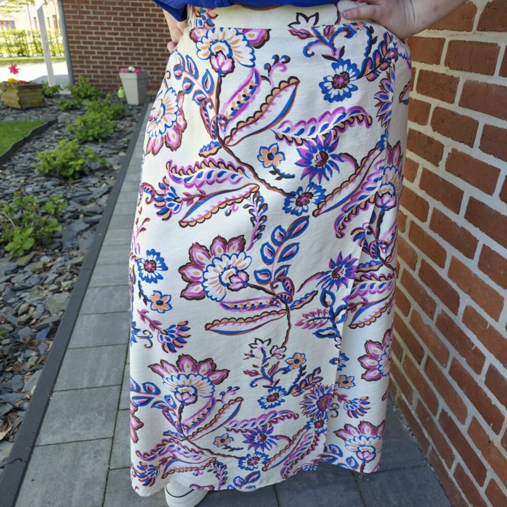 La jupe longue Léa beige aux détails bleus et roses, se distingue par son imprimé floral riche et élégant.